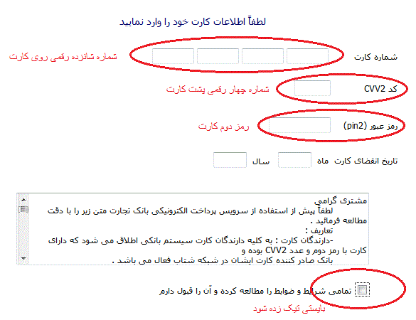 5- پس از مشخص شدن شهریه ، دانشجو با مراجعه به صفحه اصلی سایت و ورود به سیستم از لیست بالای صفحه "اطلاعات مالی دانشجو" گزینه "پرداخت شهریه از طریق سیستم شتاب" را انتخاب می نماید.سپس با کلیک بر روی دکمه "ارسال به صفحه پرداخت" و سپس وارد نمودن میزان شهریه خود روی گزینه "پرداخت از طریق بانک تجارت" کلیک می نماید.در صفحه پرداخت مطابق شکل زیر اطلاعات مورد نیاز را تکمیل نموده و از دستورات در صفحه های بعدی پیروی می نماید تا روال پرداخت شهریه به اتمام برسد.